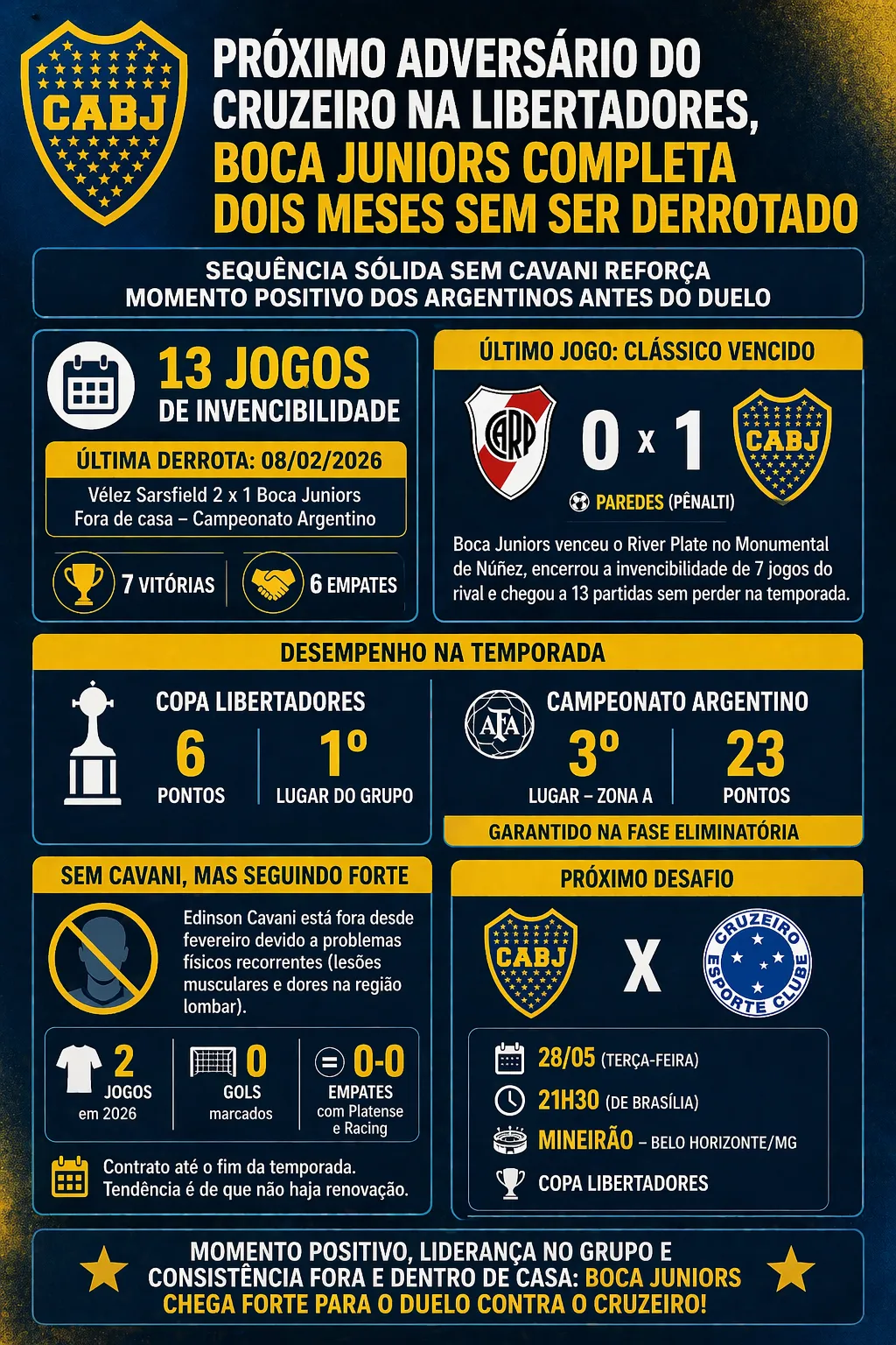 O bom desempenho coincide justamente com a ausência de Cavani, principal nome do elenco. O atacante enfrenta problemas físicos recorrentes, como lesões musculares e dores na região lombar. Em 2026, atuou apenas duas vezes (empates em 0 a 0 com Platense e Racing), ainda em fevereiro, sem marcar gols.