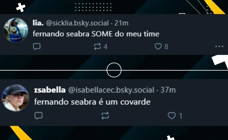 Também na mesma plataforma, uma torcedora do Cruzeiro ironizou: “Oração do Fernando Seabra hoje às 23:58 para que todos os times que o Cruzeiro enfrente a seguir sejam horríveis nível amador assim, pra dessa forma ele conseguir manter seu cargo de treinador”.