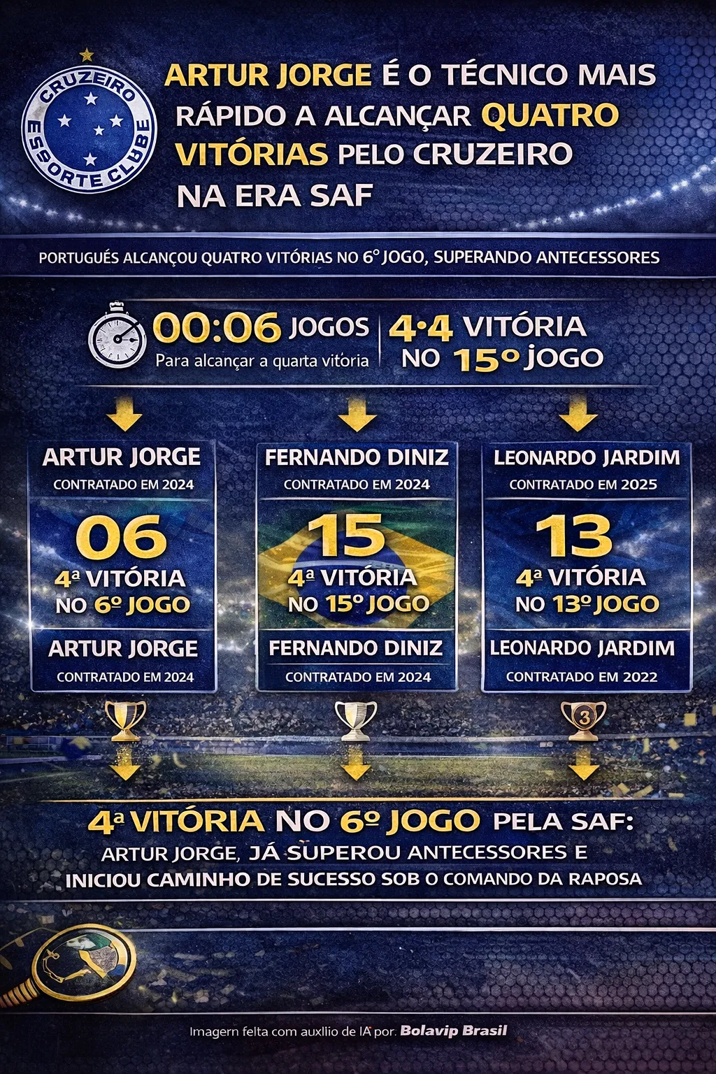 Artur Jorge foi o treinador, na Era SAF, a atingir sua quarta vitória mais rapidamente no comando do Celeste, conseguindo o feito em apenas seis jogos. Quando Pedro Lourenço adquiriu a SAF do Cruzeiro, em abril de 2024, o técnico era Fernando Seabra.