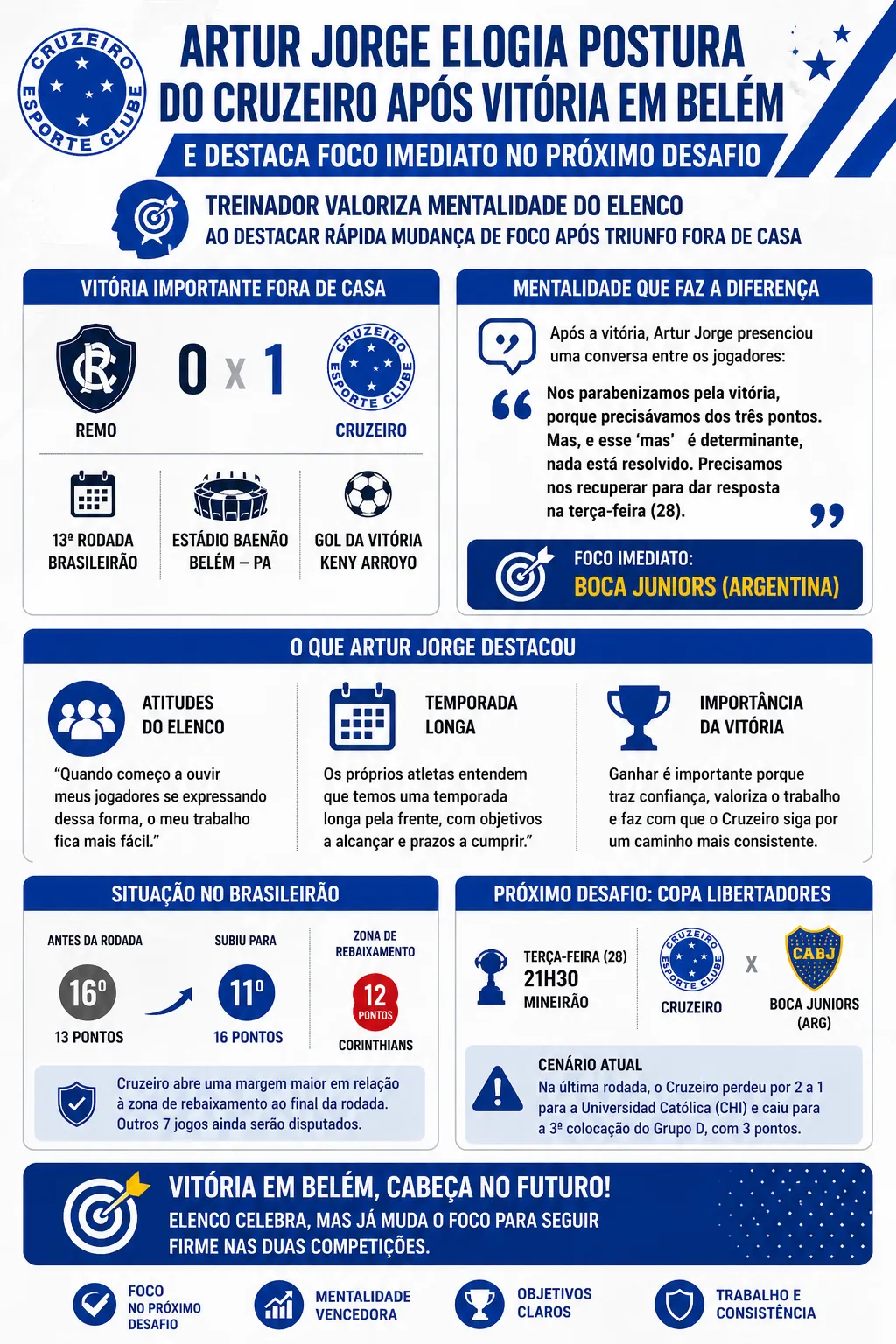 O triunfo fora de casa foi bastante comemorado pela equipe cruzeirense, que superou diversas adversidades para sair com um resultado positivo. Ainda no vestiário do Baenão, o técnico Artur Jorge presenciou uma conversa entre os atletas do Cruzeiro e a revelou ao elogiar a postura do elenco.