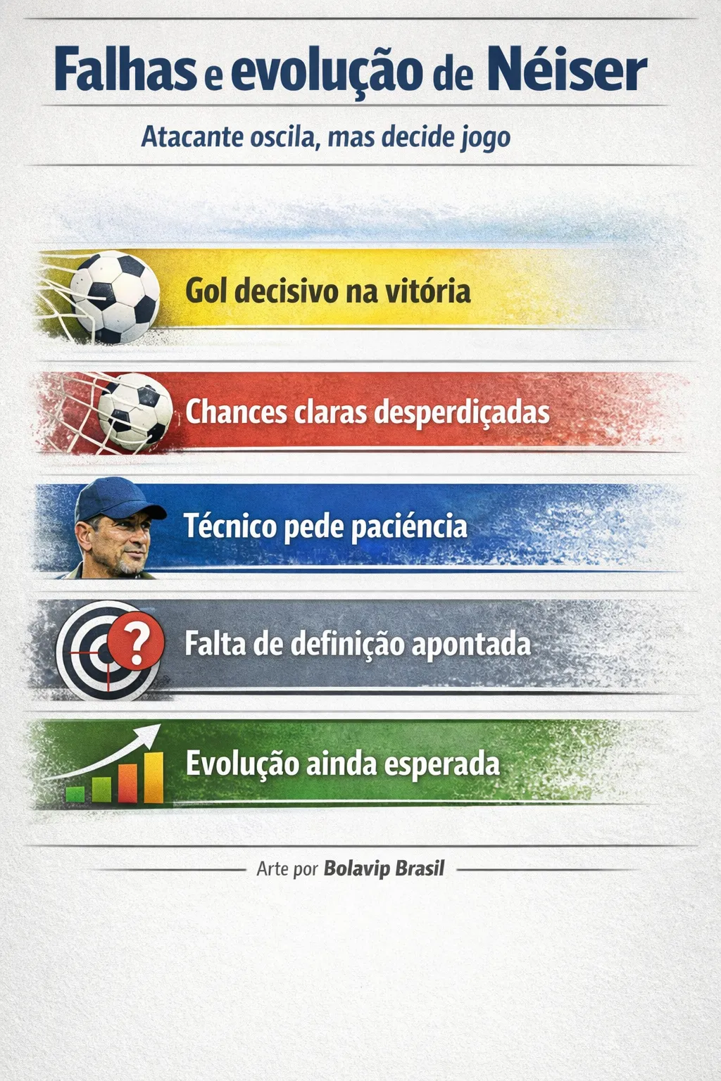 Era apenas o segundo jogo de Néiser Villarreal sob o comando de Artur Jorge, que, por sua vez, ainda tateia o time após quatro partidas à frente do Cruzeiro. Na rodada anterior do Campeonato Brasileiro Série A, o atacante fora figura quase protocolar: sete minutos em campo na goleada sofrida diante do São Paulo. Desta vez, ganhou 83 minutos. Contratado como reforço para a temporada, Villarreal soma, até aqui, 10 jogos e três gols.