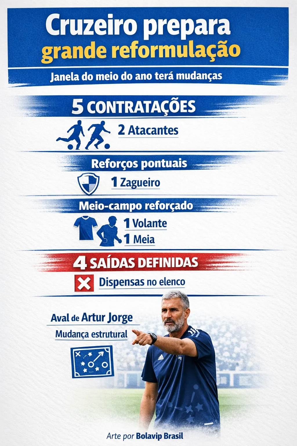De acordo com as informações trazidas pelo perfil Cruzeiro365, na rede social X, Artur Jorge já aprovou e a diretoria celeste irá atrás de 5 reforços para a próxima janela de transferências.