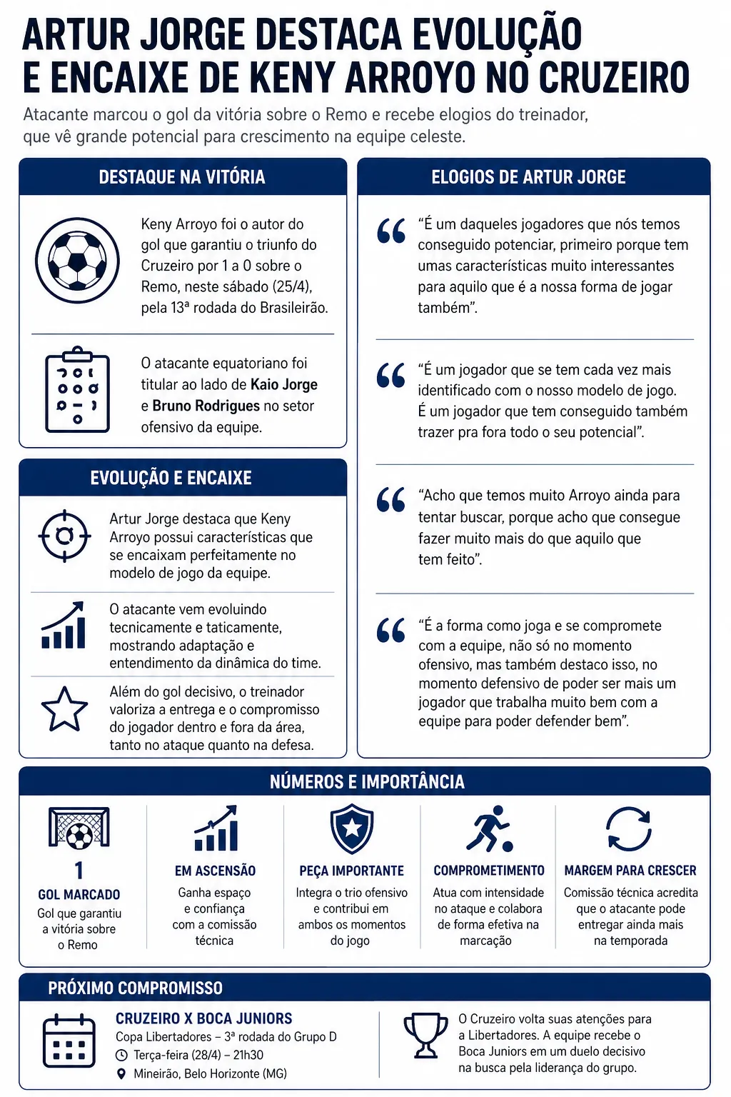 A vitória do Cruzeiropor 1 a 0 sobre o Remo, na noite do último sábado (26), pelo Brasileirão, reforçou o bom momento vivido por Keny Arroyo e o jogador recebeu elogios públicos de Artur Jorge, que destacou a sua evolução.