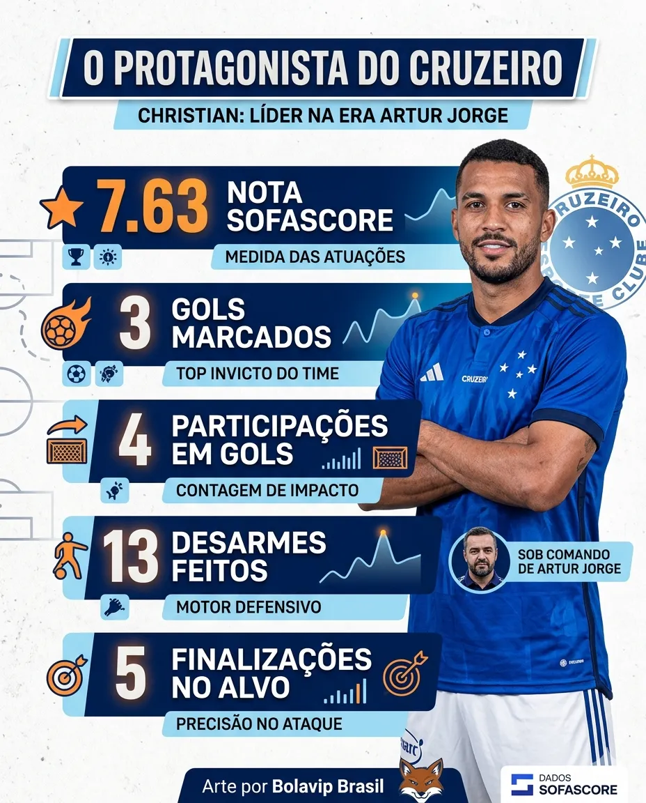 Enquanto os olhares ficam sob Kaio Jorge, Gerson e outros nomes de maior peso, outro jogador é quem vem fazendo a diferença em início de trabalho de Artur Jorge. Nos últimos quatro jogos do Cruzeiro, Christian marcou três gols e deu uma assistência.