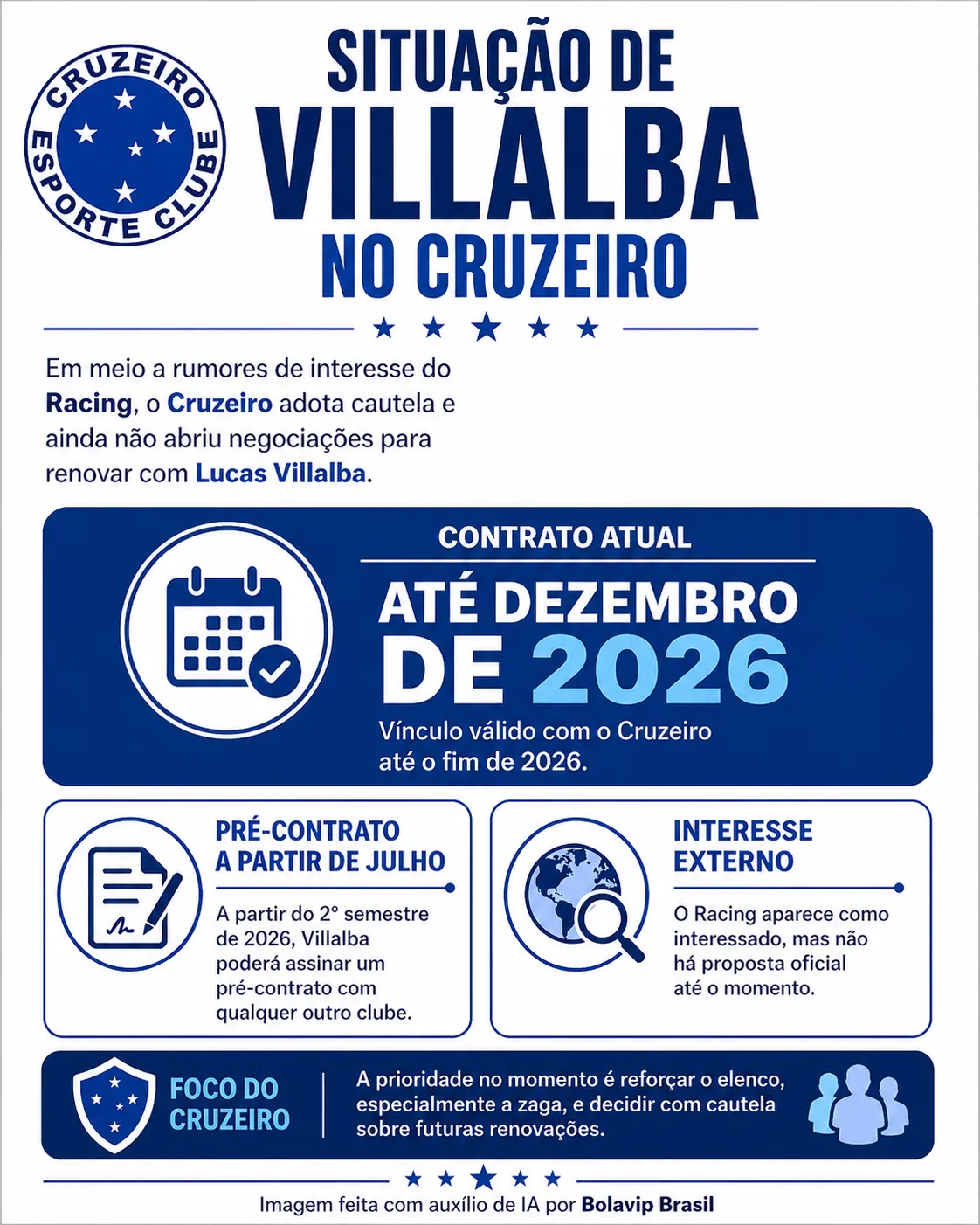 No atual cenário, Lucas Villalba possui contrato válido até dezembro de 2026. A partir do 2° semestre, pode assinar um pré-vínculo com qualquer outro clube caso não permaneça na Raposa.