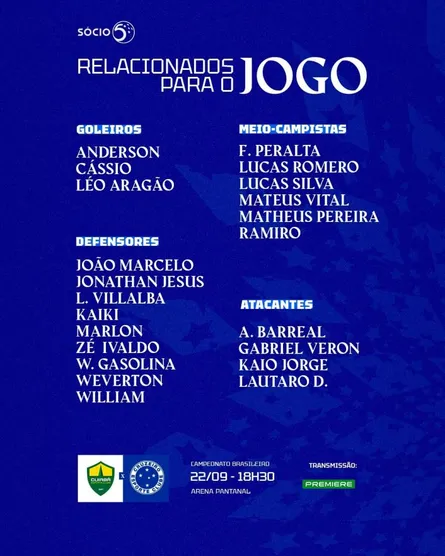Na noite deste sábado (21), o Cruzeiro divulgou nas redes sociais a lista dos jogadores relacionados para a partida diante do Cuiabá, jogo que o Bolavip Brasil transmite em tempo real a partir das 17h (de Brasília).