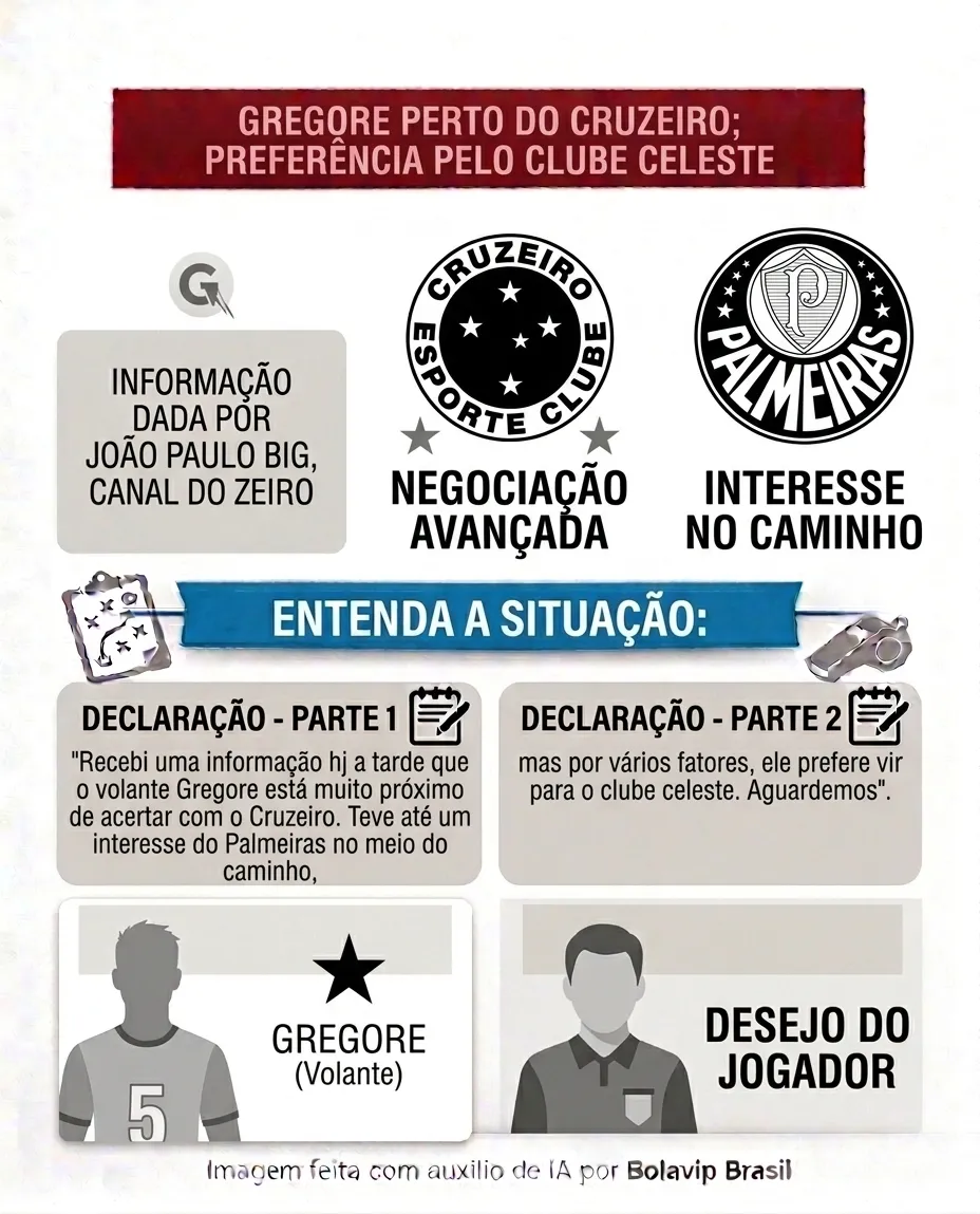 “Recebi uma informação hj a tarde que o volante Gregore está muito próximo de acertar com o Cruzeiro“, iniciou o comunicador, admitindo que a Raposa deve vencer a concorrência: