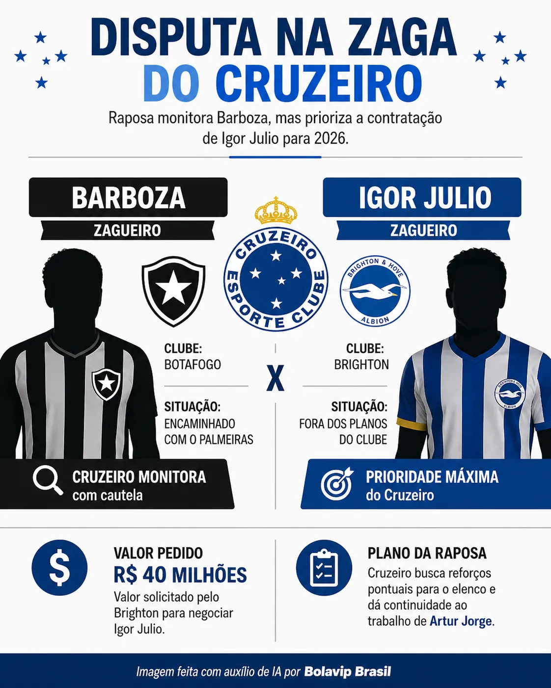Fora dos planos do Brighton, da Inglaterra, o zagueiro de 28 anos é o principal alvo da Raposa para a posição. Além disso, a equipe inglesa deseja negociar o defensor brasileiro na próxima janela europeia.