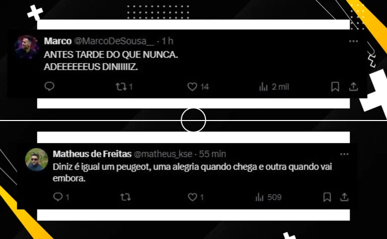 “Apesar de não concordar, na época entendi a manutenção porque pensei q houvesse alguma convicção da diretoria né. Só mostra que mantiveram o Diniz sem convicção nenhuma. Tem que melhorar muita coisa. Que não errem de novo e o próximo treinador tenha estabilidade!”, postou um dos perfis que se manifestaram.