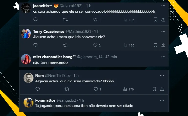 Dito isso, os cruzeirenses resolveram repercutir a ausência de Fabrício Bruno na amarelinha. Entretanto, como ainda não vem desempenhando um futebol de encher os olhos pela Raposa, grande parte da torcida concordou com Dorival.