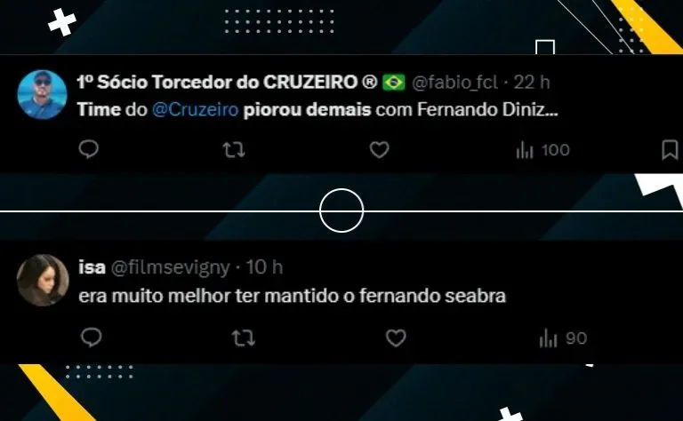“A diretoria do Cruzeiro, errou muito em demitir o Seabra, mesmo oscilando tava fazendo um bom trabalho. Agora por status, deve ficar fora da Libertadores, e deve perder para o Lanús. Diniz está muito mal, invés de evoluir e melhorar, ele piorou muito”, publicou outro torcedor.