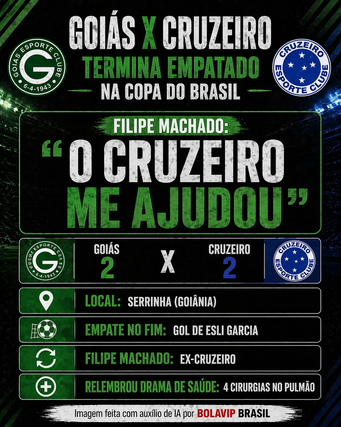Em duelo realizado no Estádio Serra Dourada, o Esmeraldino abriu o marcador, viu a Raposa virar e, nos últimos segundos, buscou a igualdade no placar, com Esli Garcia. Todavia, após o apito final, algo que chamou atenção foi a declaração de Filipe Machado.