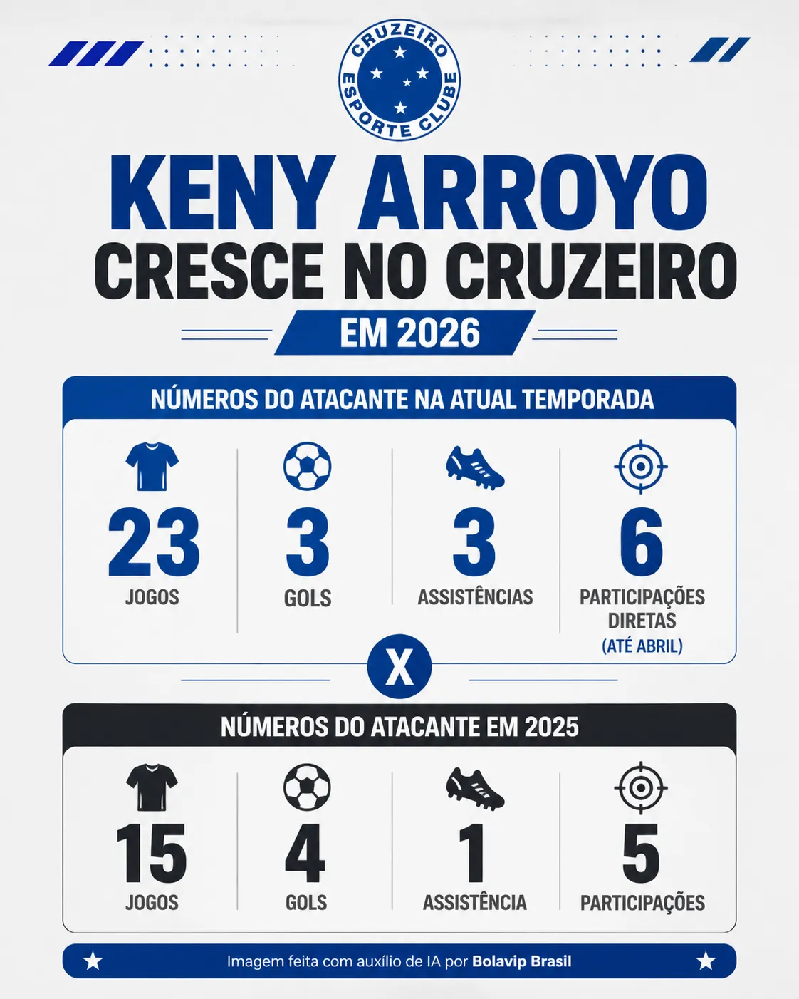 Protagonista do Cruzeiro na vitória sobre o Remo, Keny Arroyo vive seu melhor momento no futebol brasileiro. Superando os números da temporada passada, o atacante soma três gols e três assistências, evidenciando evolução desde a chegada de Artur Jorge.