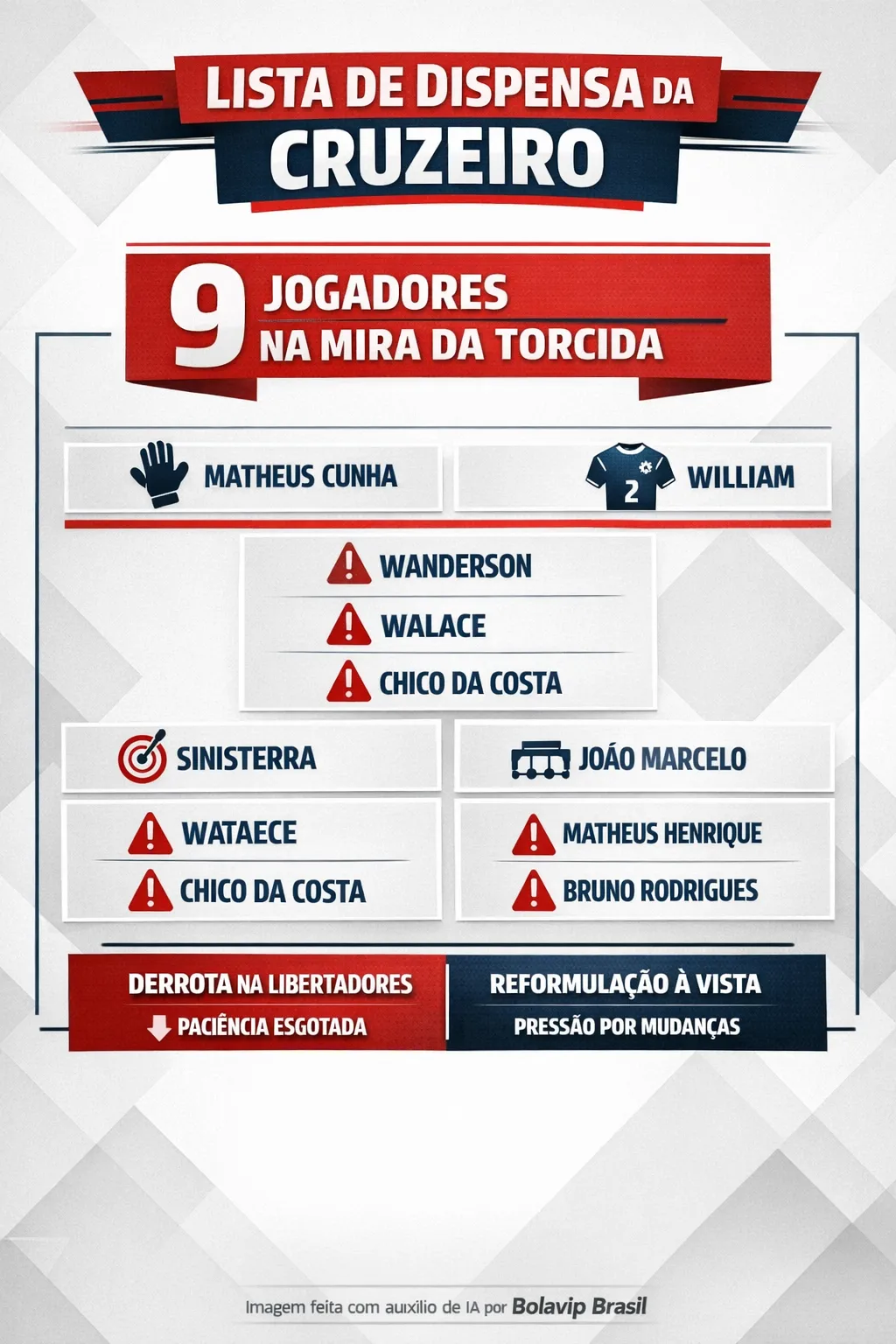 “Matheus Cunha, ‘pseudo lateral’ William, João Marcelo, Matheus Henrique, Walace, Wanderson, Chico da Costa, Marquinhos e Sinisterra”, cobrou outro cruzeirense.