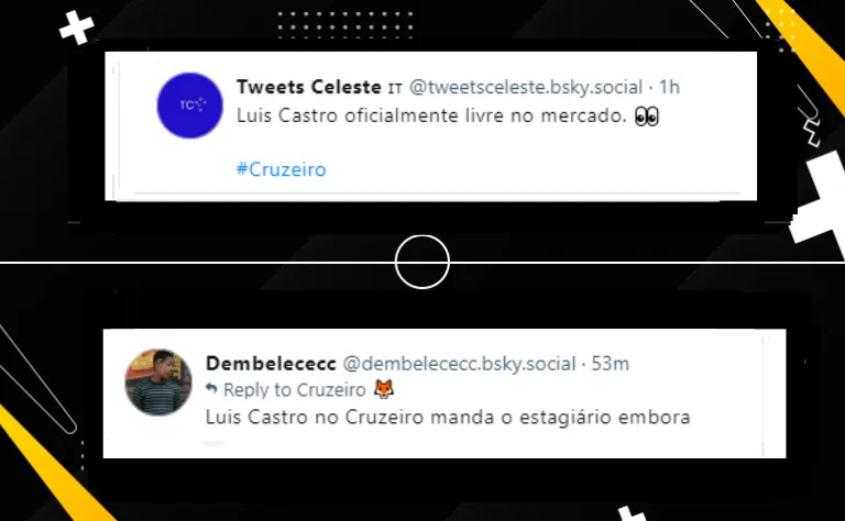 Mal o anúncio foi feito e muitos cruzeirenses passaram a pedir sua contratação. Pelo Bluesky, o SEO da Raposa, Alexandre Mattos, foi intimado: “Vai trabalhar, por**. Queremos Luis Castro no Cruzeiro”, disse um torcedor.