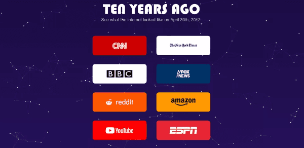 Este é objetivo do site Ten Years Ago (https://neal.fun/ten-years-ago/). A plataforma registracomo a internet era há exatos 10 anos. Ou seja, se você acessar o site hoje, dia 09 de maio de 2022, ele irá te mostrar como era a internet no dia 09 de maio de 2012.