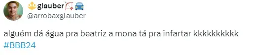 “Beatriz tem que tomar um chá de noção hein pqp, quase que sobe em cima do xande, atrapalhando a visão do cara, simplesmente uma CHATA mano”, criticou outro.