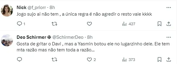 “Irmão, ontem eu cheguei para conversar com você, antes de acontecer tudo, e hoje você me abraçou, brinquei com você, e estava tudo bem. E você queria que eu estivesse no paredão no seu lugar. Enxergo isso como uma grande falsidade”, dispara Davi.