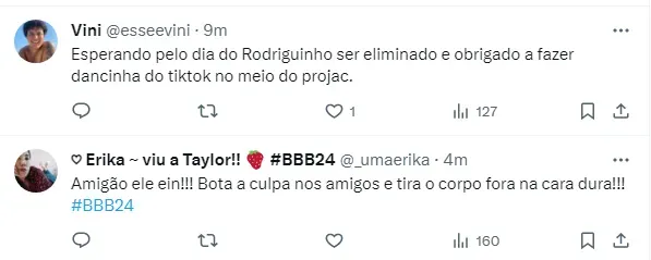 Para Yasmin e Pitel, Rodriguinho declarou que sequer lembrava se estava presente na conversa com os demais brothers. “Caraca, isso aí tô tentando todo dia lembrar, ontem de novo peguei os meninos…”, disse ele, nesta segunda (22).
