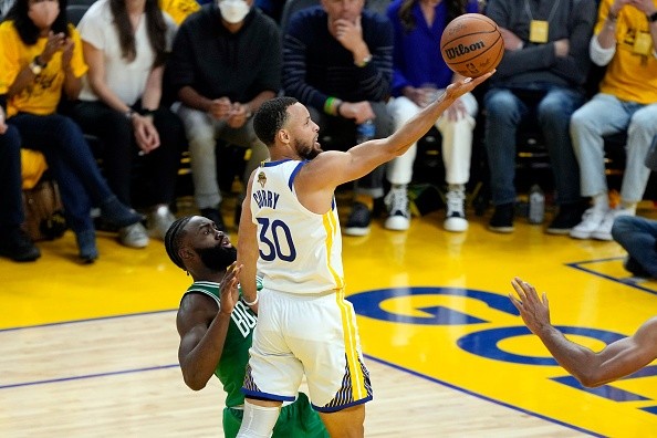 No primeiro quarto, Curry fez chover bolas de 3: foram seis cestas emoito tentativas, recorde de um atleta nas finais da liga em um quarto. Com 21 pontos, ele igualou Michael Jordan, em 1993, como o jogador com o maior número de pontos em um período. O Boston conseguiu se manter competitivo comJayson Tatum e Marcus Smart. No segundo quarto, destaque para a defesa dos Celtics, que frearam o ímpeto dos Warriors e saíramcom vantagem no intervalo: 56 a 54.
