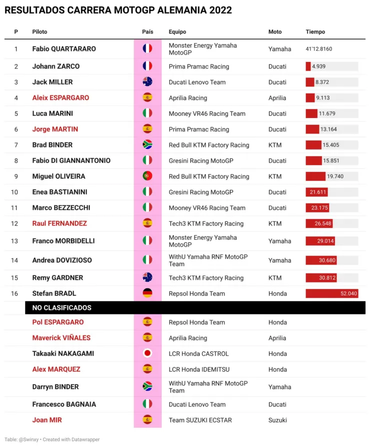 Bagnaia saiu gesticulando, descontente com o erro e chegou muito irritado no box. Queria melhorar a quinta colocação na temporada e abriu caminho para Quartararo aumentar sua vantagem na frente. Sem rivais, o francês abriu mais de quatro segundos na frente e correu “sozinho” na Alemanha. O compatriota Johann Zarco terminou na segunda posição, com o australiano Jack Miller ultrapassando o espanhol Aleix Espargaro no fim e completando o pódio em Sachsenring.