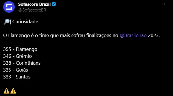 Posto isso, além da derrota poder pesar lá na frente na tabela do Brasileirão, o Rubro-Negro também carrega um peso de outros jogos. Afinal, como sofreu 15 finalizações na partida de ontem (sendo nove no alvo), o Mais Querido se tornou o time que mais cedeu chutes aos adversários entre todos os 20 da Série A. Ao todo, são 355 finalizações concedidas.
