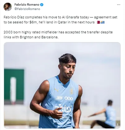 “Fabrício Díaz conclui hoje sua transferência para o Al Gharafa – acordo previsto para ser selado por US$ 6 milhões, ele desembarcará no Catar nas próximas horas. O meio-campista altamente conceituado nascido em 2003 aceitou a transferência, apesar das ligações com Brighton e Barcelona”, informou Fabrizio Romano.