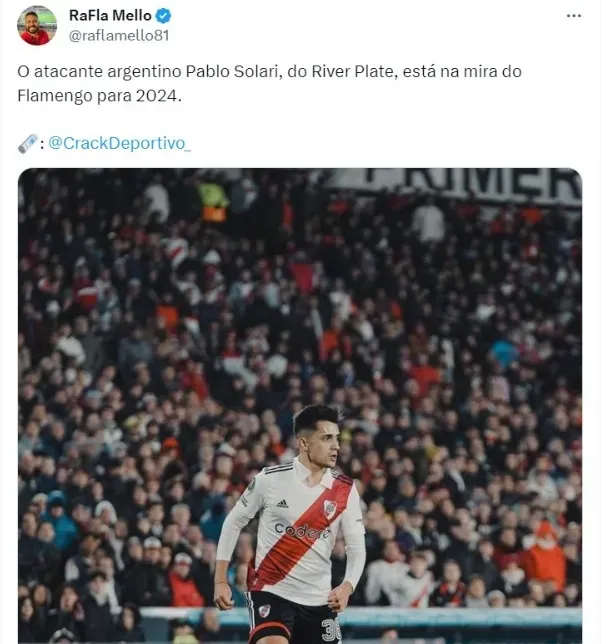 Segundo o jornal argentino Crack Deportivo, o Flamengo começou a monitorar a situação do atacante Pablo Solari, do River Plate.