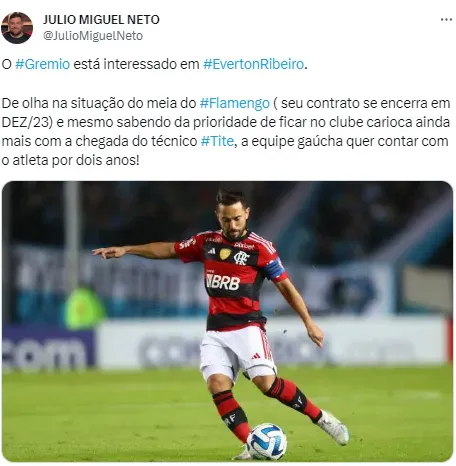 “O Grêmio está interessado em Everton Ribeiro. De olha na situação do meia do Flamengo (seu contrato se encerra em dezembro de 2023) e mesmo sabendo da prioridade de ficar no clube carioca ainda mais com a chegada do técnico Tite, a equipe gaúcha quer contar com o atleta por dois anos”, publicou Julio Miguel Neto em suas redes sociais, destacando que o Tricolor Gaúcho tentará seduzir o ídolo flamenguista com um contrato mais longo do que o que deve ser oferecido pelo Rubro-Negro Carioca.