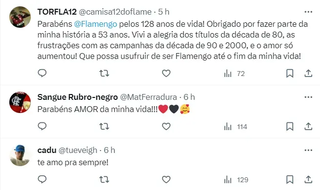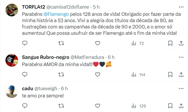 Evaristo de Macedo e até os atletas que deixaram o clube há pouco tempo, como Willian Arão, Vitinho e Reinier, deixaram mensagens ao Mengão. Confira abaixo como a torcida a Maior Torcida do Mundo reagiu ao aniversário do Fla.