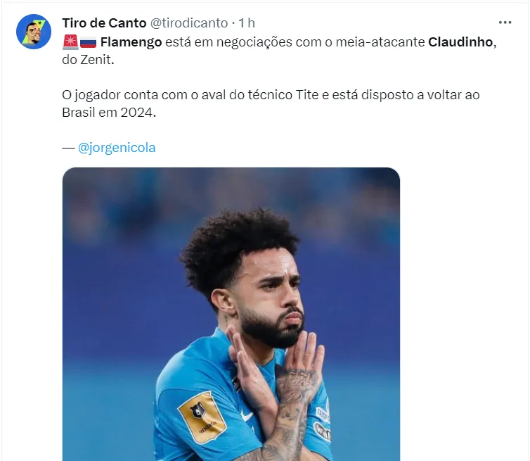 Claudinho, ex-atacante do Red Bull Bragantino e que foi sonho do Palmeiras nas duas últimas janelas, interessa ao Flamengo. Uma fonte superimportante (…) me chamou na noite da última terça-feira (14), para contar que o Flamengo quer o Claudinho e está disposto a comprá-lo em definitivo do Zenit”, entregou.