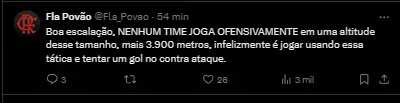 Com isso, a Nação foi pega de surpresa. Pois o time se desenha para ir a campo contra os bolivianos num esquema com uma linha de cinco na defesa e só um atacante isolado. Ou seja, o Fla deve ir a campo num esquema 5-4-1.