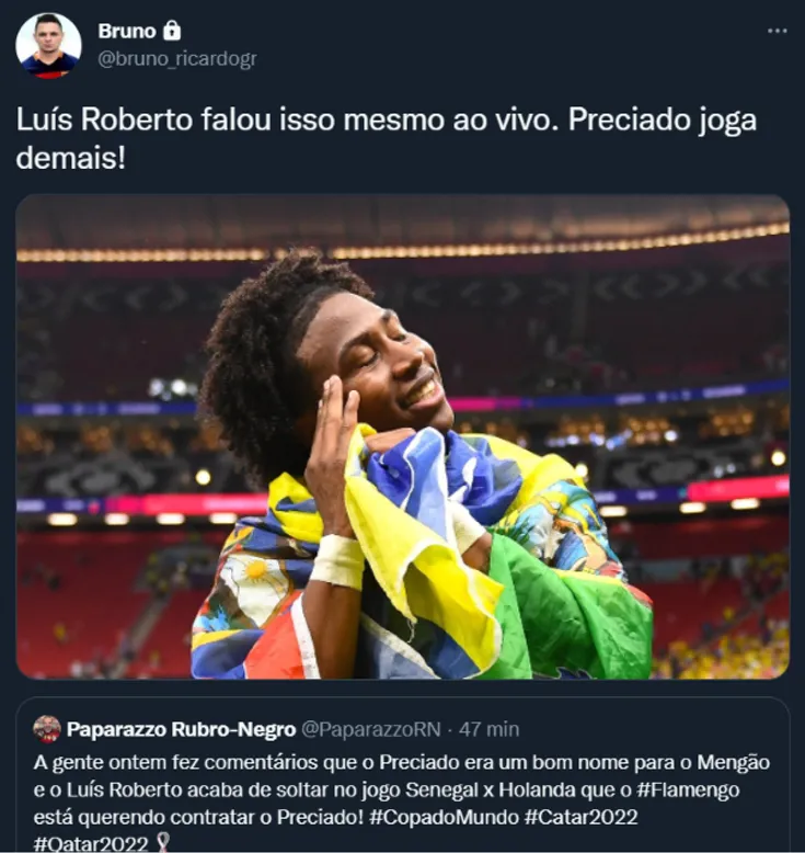 “Luís Roberto acabou de falar que o Flamengo tá interessado no Preciado do Genk”.