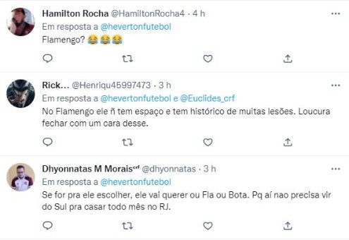 A notícia provocou insatisfação em boa parte da torcida, que se manifestou nas redes sociais: “Me parece fake , Flamengo nunca iria atrás desse cara”, escreveu um Rubro-Negro não acreditando na transação. “Que passe longe do Flamengo, o aposentado Dr Douglas Costa”, se revoltou outro.