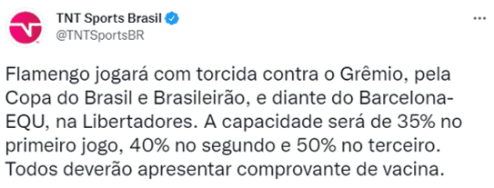 No dia 22, contra o Barcelona, a expectativa é que o Maracanã receba 50% dos assentos disponíveis no Maracanã, ou seja, 45.035 torcedores. A Prefeitura considera essas três partidas como “eventos-teste” dentro do plano de reabertura dos portões dos estádios no Rio de Janeiro, que ainda não receberam público em 2021.