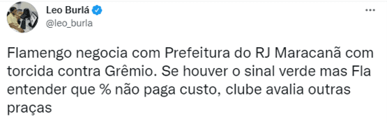Segundo Burlá, a expectativa do Rubro-Negro é que um decreto seja publicado pela Prefeitura da cidade até a próxima sexta-feira (3). Caso não seja atendido, o clube não descarta levar a partida contra o Grêmio para outro local. Em Brasília, por exemplo, o Flamengo teve a torcida a seu favor na Libertadores, nas fases de oitavas e quartas de final.