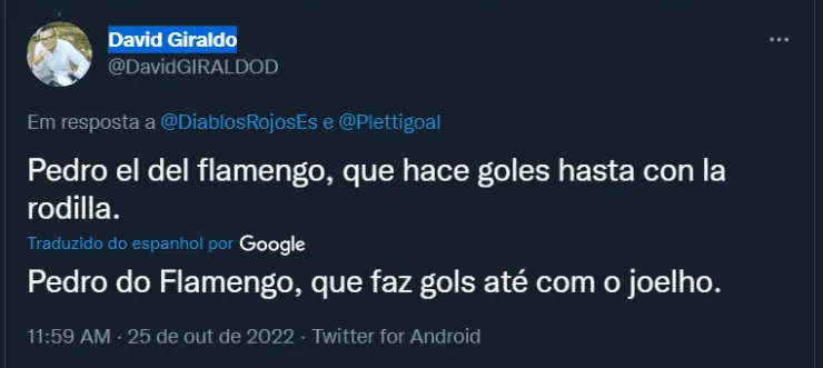 “Pedro do Flamengo, que faz gols até com o joelho”, se empolgou e pediu o torcedor David Giraldo.