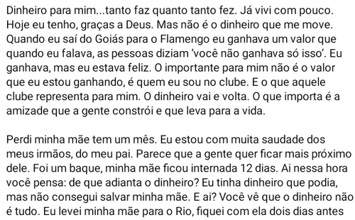 “(…) Teve um dia que eu não estava conseguindo concentrar (no Flamengo). Falei para ele me manda embora, eu assino qualquer coisa, quer que eu devolva o dinheiro… faço qualquer coisa aqui, só quero ir embora. Ele perguntou o porquê, aí eu falei que estava assim, assim, assado. Contei tudo. (…) Aí ele falou: ‘tranquilo, vai para sua casa. Você acha que só você tem problema?Não, também tenho. Sou ser humano que nem você. Vai para sua casa, amanhã vou te por para jogar’. Foi no jogo do Fluminense eu acho ou Botafogo que eu fiz o gol (…)”, afirmou Michael.