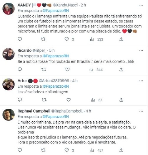 A informação foi vista por muitos como preconceituosa, pois crava um folclore batido e ultrapassado sobre a rivalidade Rio-SP: “Sério, como que podem ser tão levianos de plantar esse tipo de informação para embasar uma narrativa?! Depreciar a cidade do RJ, aparentemente de forma mentirosa, para sustentar esse discurso clubista?!”, escreveu outro Rubro-Negro.