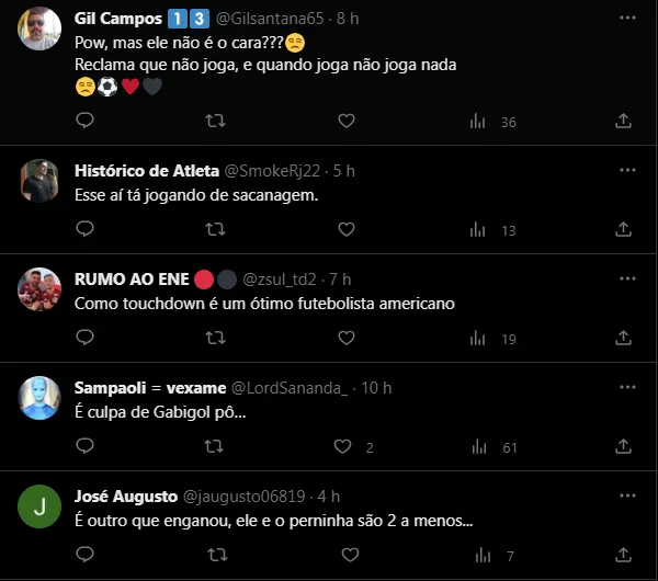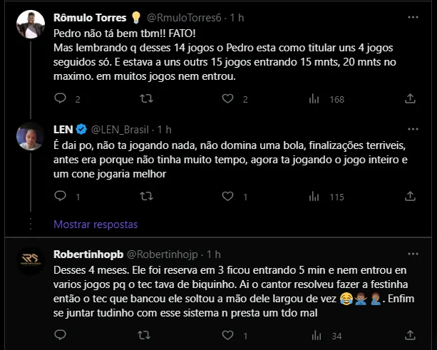 De acordo com levantamento feito pela Coluna do Fla, o camisa 9 da Gávea conseguiu finalizar apenas seis vezes nos últimos sete jogos. Destes arremates, apenas três foram na direção da meta. Isto é, por mais que o jogador viva uma má fase, a falta de oportunidades evidencia como o coletivo está abaixo sob comando de Jorge Sampaoli. Confira alguns comentários de flamenguistas divididos com o momento de Pedro pelo atual campeão da América: