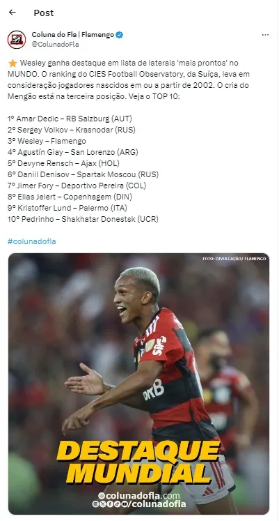 Em pesquisa feita pelo CIES Football Observatory (Centro Internacional de Estudos Esportivos), da Suíça, Wesley foi eleito o terceiro melhor lateral do mundo entre os nascidos a partir de 2002. O destaque do garoto no time do Flamengo rendeu reconhecimento no exterior, mas segue causando discórdia entre adeptos do Mengo nas redes sociais. Enquanto alguns apoiaram a escolha, outros ficaram inconformados.