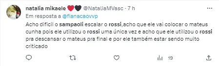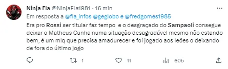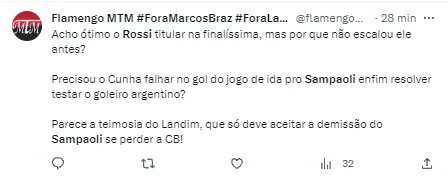 A escalação de Rossi dividiu opiniões na web. Enquanto muitos defendem a saída de Matheus Cunha, que comete falhas em sequência desde a eliminação na Libertadores, outros acham a entrada do argentino precipitada. Rossi jogou apenas esta semana depois de um grande período parado, o que gerou até uma dificuldade de ritmo de jogo no início. Agora, na avaliação de Sampaoli, ele pode ser o titular.