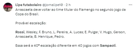 Mais cedo, o Globo Esporte vazou o que deve ser o time titular do Flamengo no próximo domingo (24). Com o objetivo de virar o placar negativo aberto no Maracanã, Arrascaeta deve começar o confronto. Além do uruguaio, que volta de lesão, o goleiro Agustín Rossi tem grandes chances de começar o confronto, tendo participado do seu primeiro jogo com a camisa do Clube na última quarta-feira (20), no 0 a 0 com o Goiás. Até por isso que uma polêmica foi levantada na web.