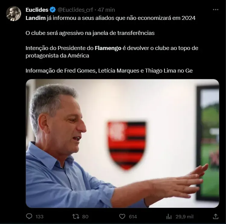 Diante desse planejamento para a temporada, com a reformulação do elenco, a direção da equipe carioca projeta a próxima janela de transferência como a maior da história no quesito investimento. Já que o Flamengo não irá renovar com jogadores em fim de contrato, colocando outros na lista de negociáveis, fazendo necessário assim, a ida ao mercado de forma mais contundente. A intenção é fechar cinco grandes contratações, para ter uma equipe qualificada em 2024.