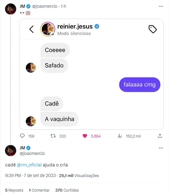 Rodrigo Muniz, Reinier e outras celebridades toparam entrar numa campanha da Nação para fazer a festa na final da Copa do Brasil. Algumas vaquinhas onlines foram iniciadas, com o objetivo de montar um espetáculo nas arquibancadas do Maracanã no confronto diante do São Paulo. Entre influenciadores, artistas ou apenas fanáticos pelo time carioca, a dupla de atletas também chegou junto.