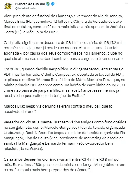 Isso porque o vice-presidente de futebol do Flamengo acaba de ter detalhes expostos sobre sua experiência política. Marcos Braz é vereador no Rio de Janeiro e, segundo reportagem do Uol, o mandatário rubro-negro teria faltado 12 vezes compromissos na Câmara.