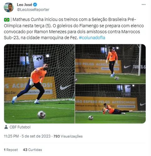 Isso porque as primeiras imagens do goleiro treinado com a Sub-23 do Brasil foram publicadas nesta última terça-feira (5), o que repercutiu ao longo do dia seguinte. A lista de jovens chamados por Ramon Menezes será utilizada nos dois duelos contra Marrocos, nos dias 7 e 11 de setembro. Serão mais ou menos 48 horas de diferença para o duelo contra o Athletico-PR pelo Brasileirão, o que retomou um antigo debate.