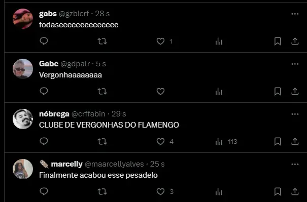 “Inaceitável a postura dos jogadores do Flamengo, em jogo que vale a classificação direta à fase de grupos da Libertadores“, disse um torcedor. Muitos também comemoram o fim da temporada, mostram a insatisfação.