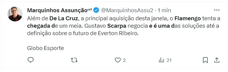 Com o acerto na contratação de Nicólas De la Cruz e Léo Ortiz, o Rubro-Negro vem avançando para a acertar com mais um craque para o elenco no próximo ano. Buscando superar a concorrência, a gestão vem agindo de forma rápida e eficaz no mercado.