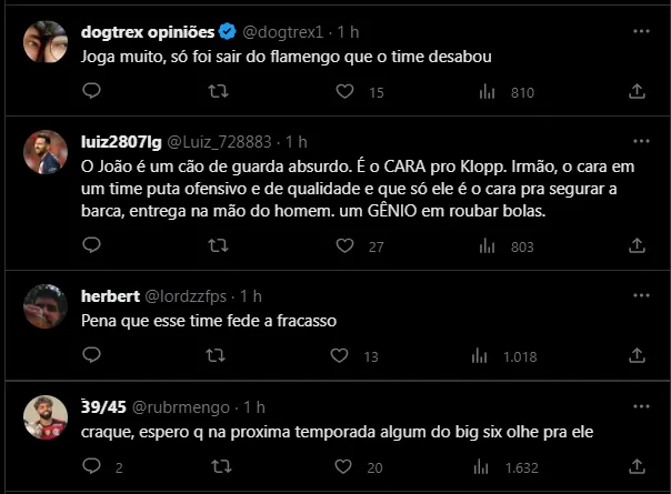No jogo de hoje (16), por exemplo, ele foi o líder de desarmes de toda a partida, com seis. Além disso, colaborou com outras duas interceptações e acertou quase 90% dos passes que tentou. Os dados são do Sofascore. Não à toa, o volante foi muito elogiado na web por torcedores de vários clubes, mas também recebeu inúmeros pedidos para deixar a equipe e se transferir para um gigante inglês. Confira: